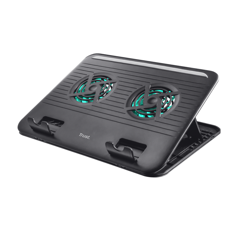 Notebook stand with 2 built-in silent cooling fans for a comfortable tilted typing position and protection against overheating